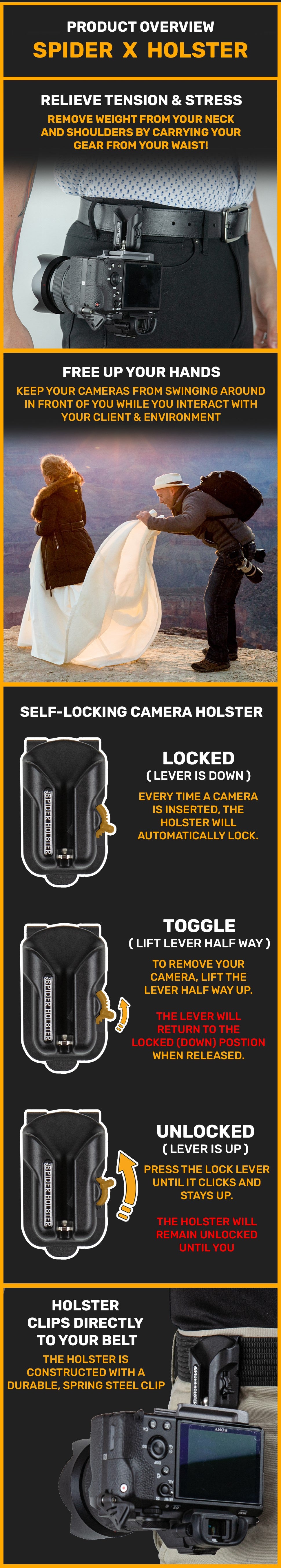 The Spider X is a versatile, multi-use carrying system that allows you to carry a light to medium weight camera with comfort and ease and is the perfect carrying solution for anyone looking for a strap-free system, and allows you to carry a mirrorless camera with comfort and ease, using any belt.