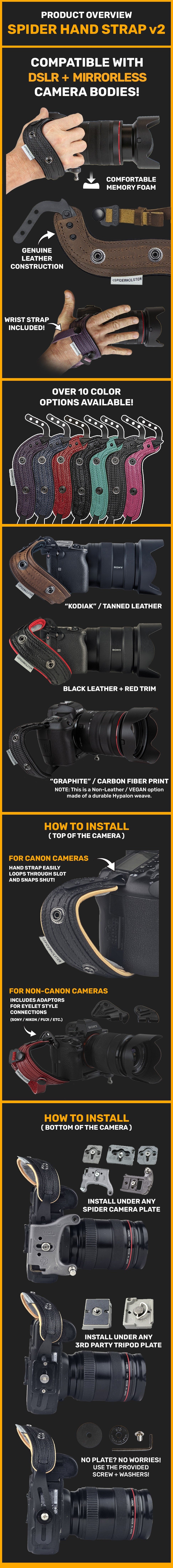 ✅ INSTALLS UNDER YOUR CAMERA PLATE: This hand strap is designed to install underneath of a Spider Camera Plate or 3rd party tripod plate.