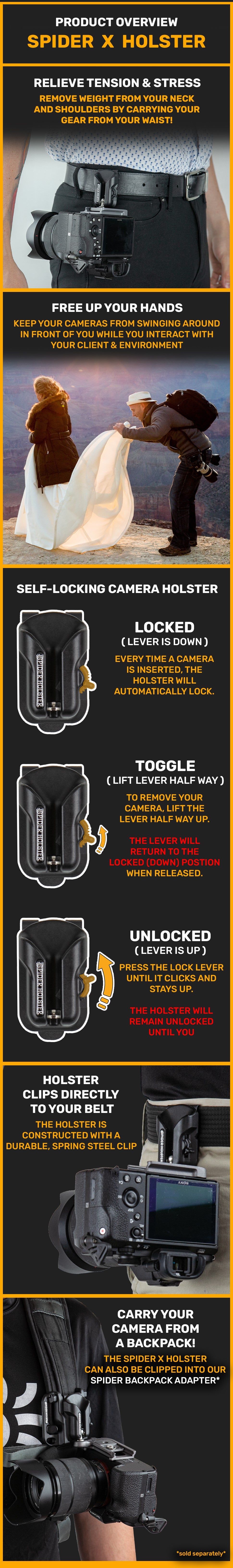 ✅ QUICK-DRAW: Use the camera holster lock's optional camera quick release position to draw without touching the lock switch. Great for when you need quick access to your cameras!