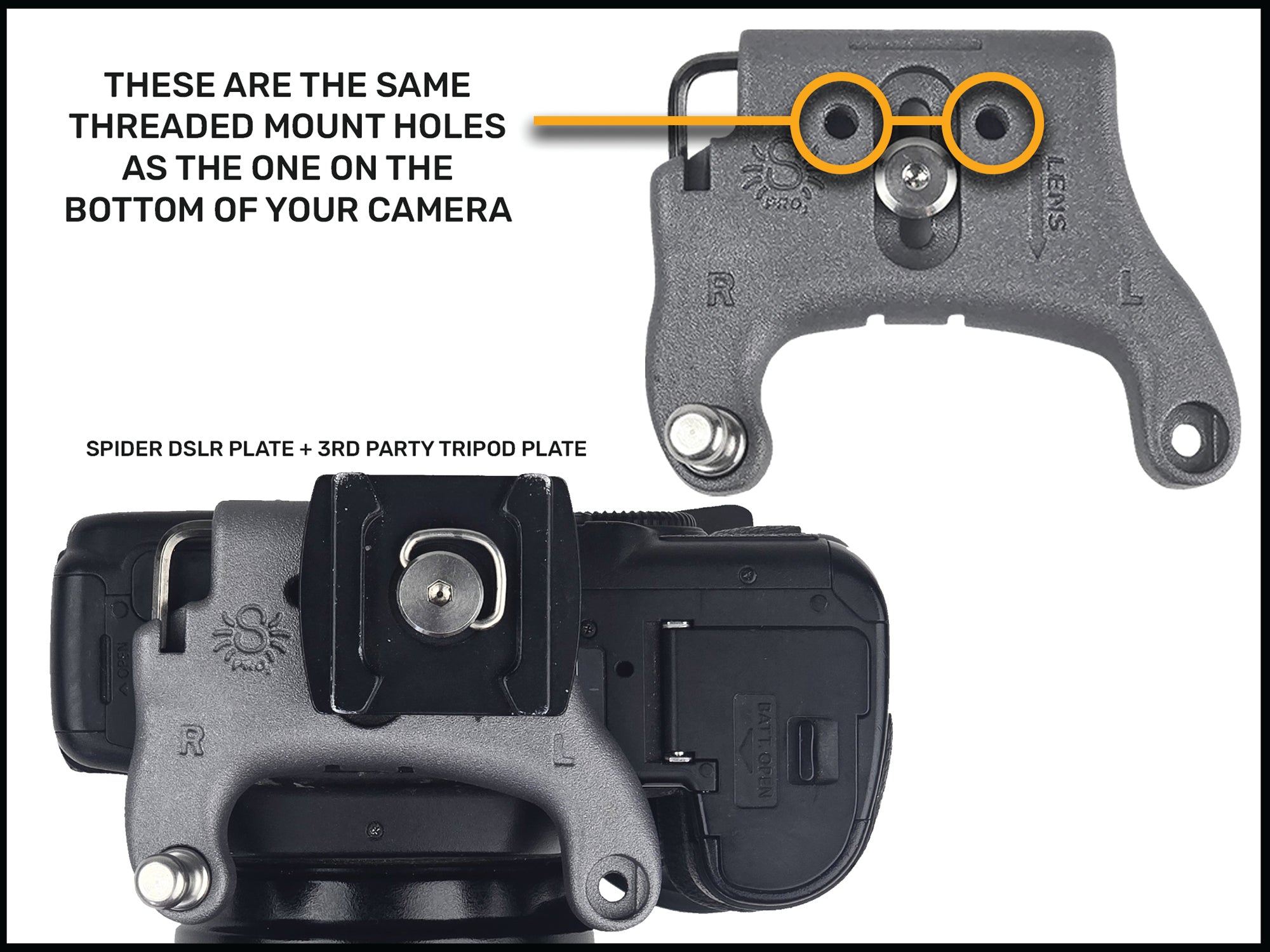 All of our Spider Camera Plates have a built-in 1/4"-20 threaded mount hole , thats the same type of mount as the one on the bottom of your camera.