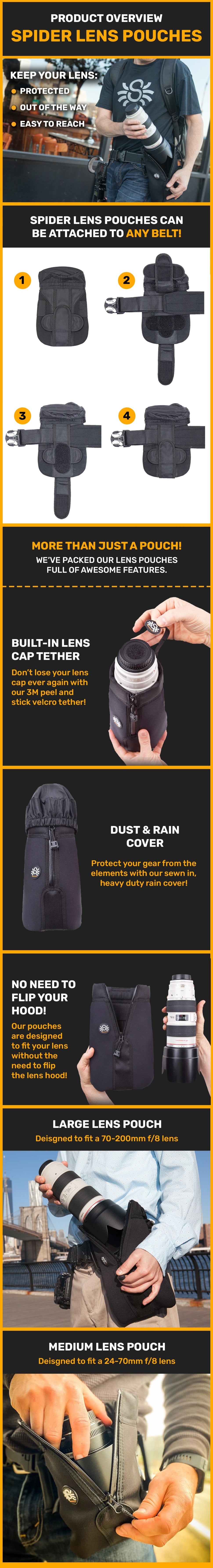 ✅ ATTACHES TO ANY BELT: High strength velcro straps wrap around your belt and secure the Spider Lens Pouch to it.