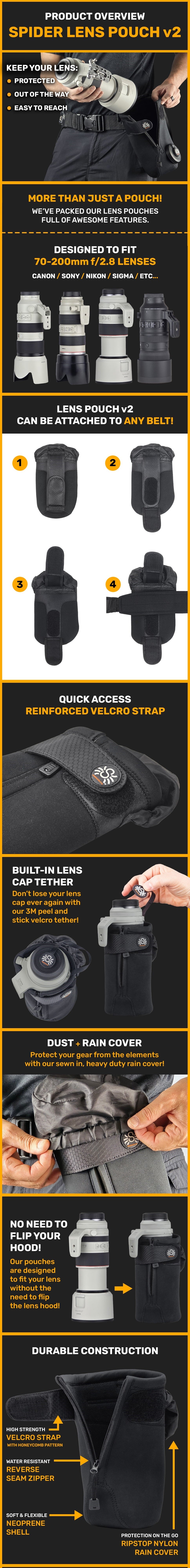The SpiderPro Lens Pouch v2 shares many of the great features of the original such as the built-in rain cover, lens cap tether and heavy duty zipper.