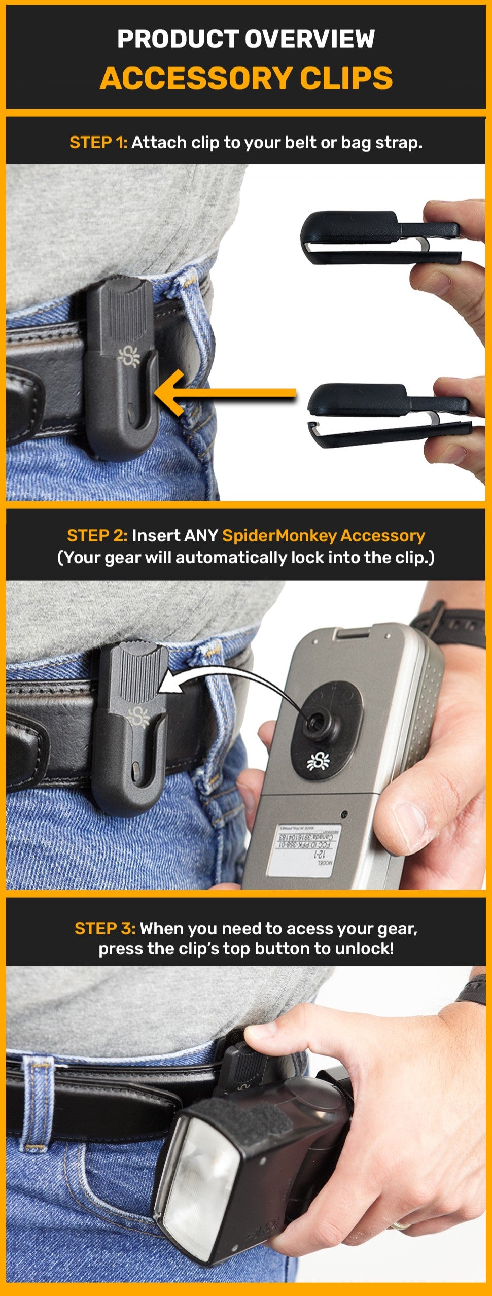 ✅ CLIP TO ANY BELT: Attach the Spider Accessory Clip to any belt, bagstrap or pocket.