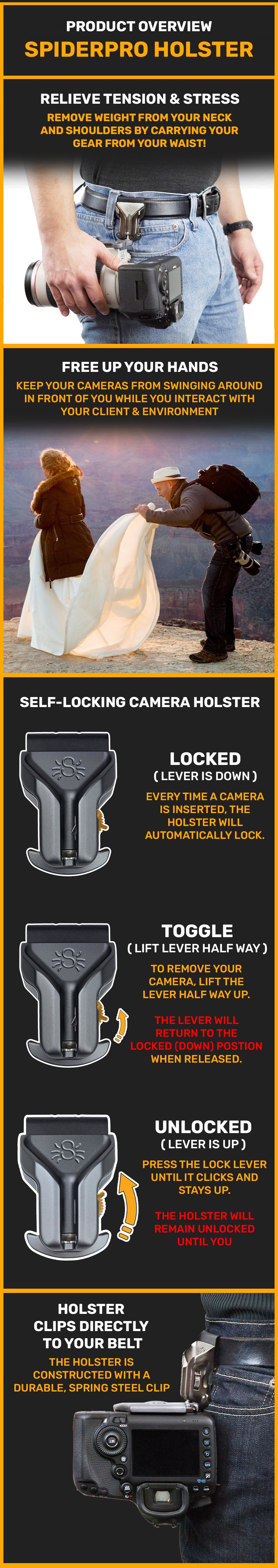 ✅ EASY TO USE: Clip the Spider Pro Camera Holster to your Spider Holster camera belt or any casual belt.